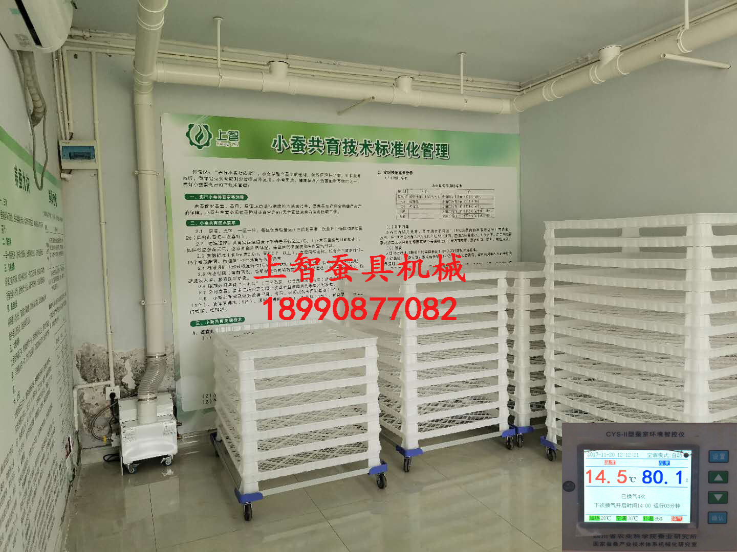 上智系列小蚕饲育机是四川南充上智农业机械有限责任公司与四川省农科院蚕业研究所共同研制开发的现代小蚕饲育设备。是由机械操作代替人工端蚕箔、撒石灰消毒、给桑等繁琐工序,该设备具有占地小,投资成本低,省工省力,操作简单的特点。是目前国内小蚕共育室最先进的智能型设备。